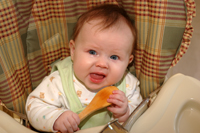 Hannah is almost always in the kitchen when Rebecca and I are preparing dinner. She is fascinated with the sounds and smells of cooking. We tried to fuel this interest by giving her a pot and a few infant-friendly utensils. I don’t think she made the connection, but she did succeed in placing every object in her mouth. Somehow the taste of a wooden spoon was far less interesting than the smell of our dinner. She is a good sport, though, and didn’t complain when we served her rice cereal.