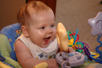 “Turning” has been the theme of the past couple of weeks. Yesterday, Hannah turned 5 months old. She has been “turning” towards more and more solid foods and away from the breast-milk only diet. And she can now successfully turn over from her stomach-to-back and back-to-stomach. She’s been teasing us with rolling over for a month, so it was a thrill to see her finally pull it off. Most of these milestones were recorded on film. Hannah’s first vegetable was pureed carrot. You could tell that she was expecting a different flavor with each spoonful, but she ate heartily. We added squash to her diet a few days ago. The vegetables have gone over so well that we’ve also introduced other new experiences to Hannah’s world, including strolls in her walker, piggyback rides on Daddy’s shoulders, and more interaction with Dakota and Madison. She has also been helping Mommy clean out the garage. Daddy helped a bit, but he also stole a few moments to take pictures of his motorcycle.