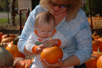 Hannah has been gearing up for Halloween this week. She won't be enjoying any of the treats this Halloween, but that won't stop her from dressing up. In fact, she's already worn two different outfits. The first was a pirate costume that Rebecca created for Uncle Dave's swashbuckling birthday party. The second was a cute "Baby's first Halloween" outfit from Grandma and Grandpa. She wore this costume when we visited the pumpkin patch. Hannah seemed to enjoy the pumpkin-selection process. The only thing she didn't enjoy was the bright sunlight in her face. Her new pair of sunglasses helped a bit, but Hannah was more interested in tasting them then wearing them.