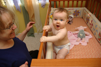 Rebecca was changing Hannah and took a short break to play an impromptu game of peek-a-boo. It didn’t take Hannah too long to figure out that Mommy was just ducking down. She kept trying to get into a better position to see Rebecca and apparently realized that she would be the winner of peek-a-boo if she could just stand up and look over the railing of her crib. And so she did. You can tell by their expressions that it was a shock to them both. Celebration ensued.