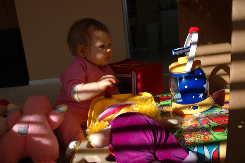 With this news out of the way, I can share some new pictures of Hannah! She seemed to enjoy having a large number of boxes in the house during the past few weeks. Many of the boxes were a good height for her to grab onto and there were enough of them in the living room that she could walk for quite a distance without having to let go. She didn’t seem to mind that all of her things were being put into boxes. Hannah also recently added climbing stairs, throwing dog toys, and decorating with toilet paper to her repertoire. It is a good thing we will have all of her grandparents nearby to help keep up with her.