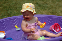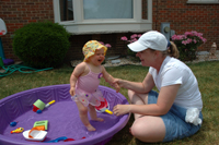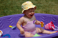 As it turns out, the purple wadding pool we picked up a couple of weeks ago was the best $5.00 we’ve ever spent. Hannah loves the pool. She will happily sit in it until she is one big bundle of pruned baby flesh. She likes standing in the water, sitting in the water, falling in the water, and splashing any person or dog who wanders too near.